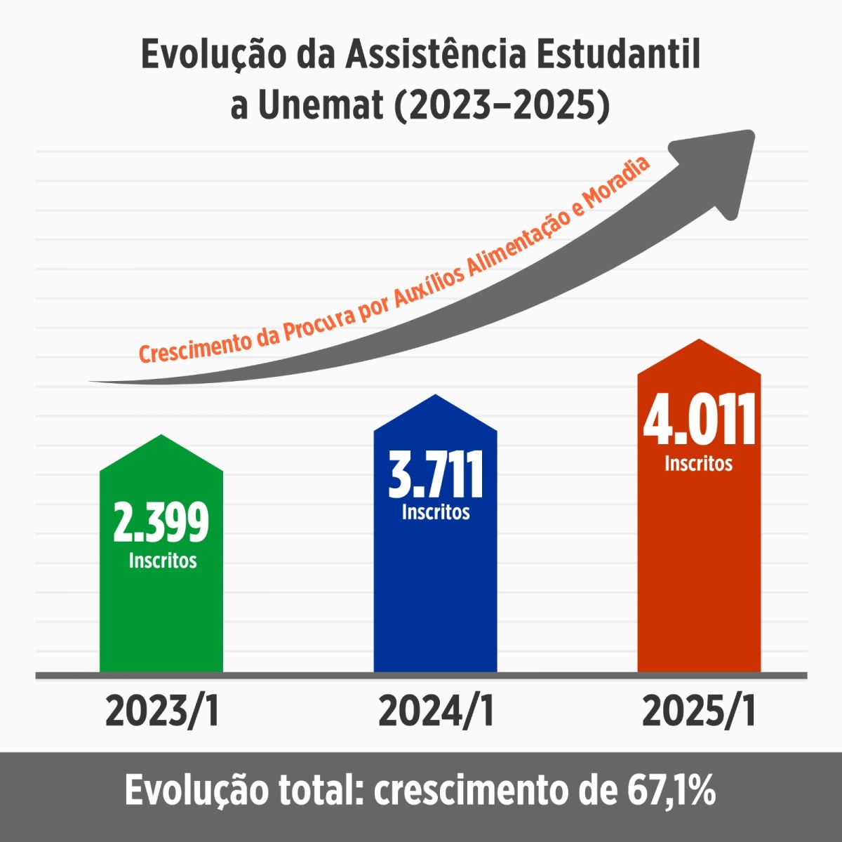 A Universidade do Estado de Mato Grosso (Unemat) registrou 4.011 inscritos nos programas de auxílio moradia e alimentação no primeiro semestre de 2025. O número representa um salto de 67% em comparação aos 2.399 registros de 2023, primeiro ano da atual gestão. O balanço da Pró-Reitoria de Assuntos Estudantis (Prae) confirma ainda a execução de 95% do orçamento previsto, índice superior à média dos últimos três anos.